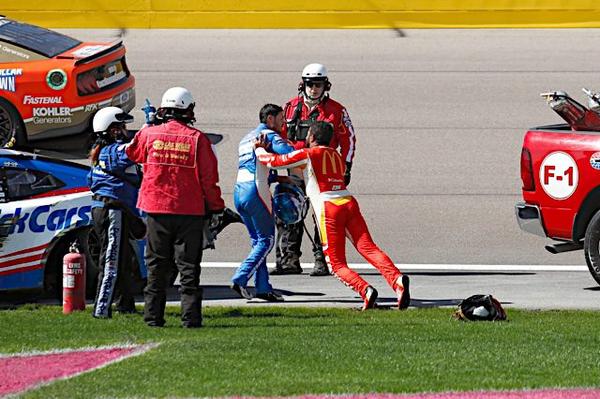 Larson. Wallace then came across the track and took out Larson. Afterwards, Wallace expressed his displeasure towards Larson by shoving him multiple times. |
